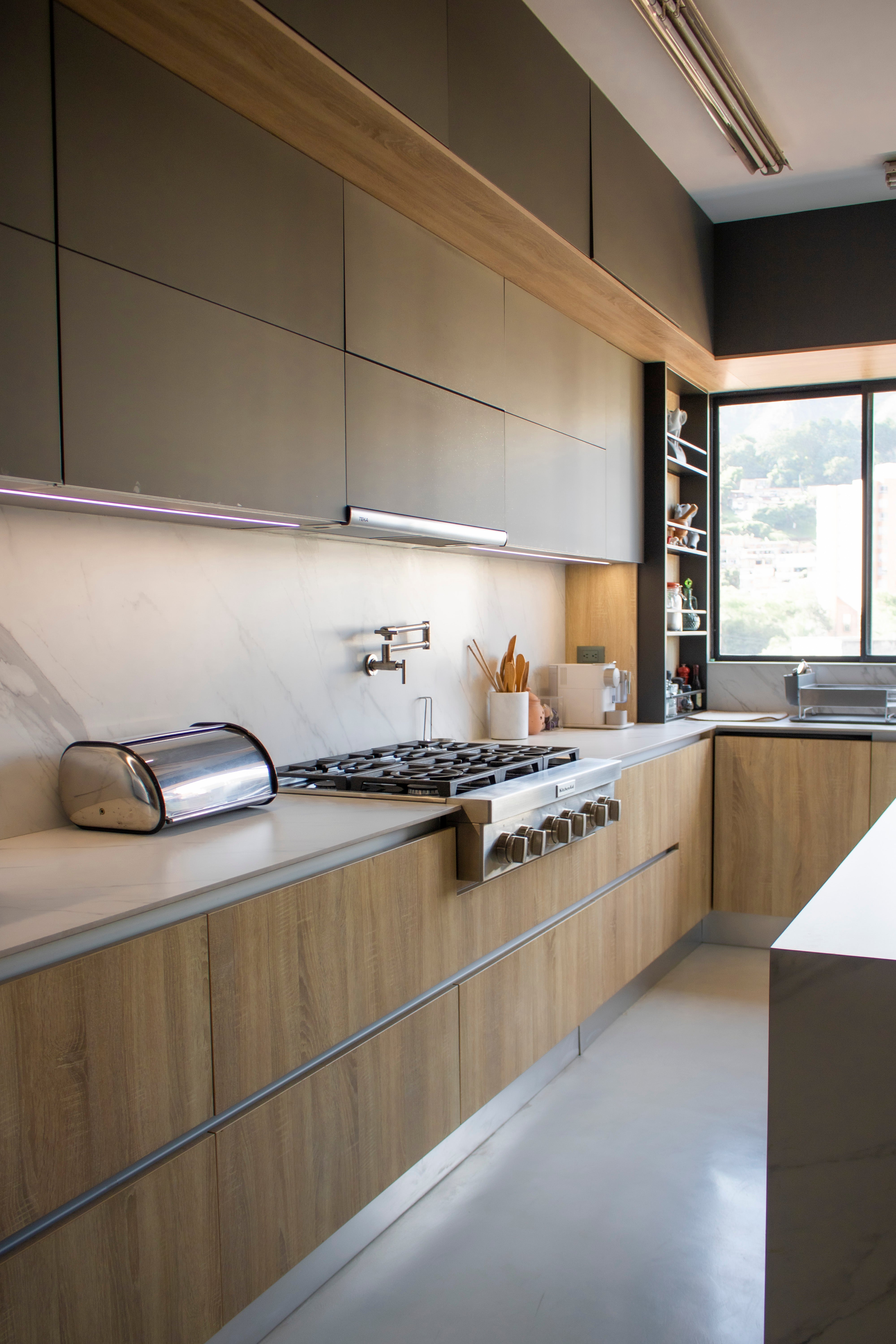 La cocina fue fabricada con carpintería arquitectónica a medida, utilizando materiales premium y herrajes de origen europeo, seleccionados por su durabilidad, estética y desempeño: