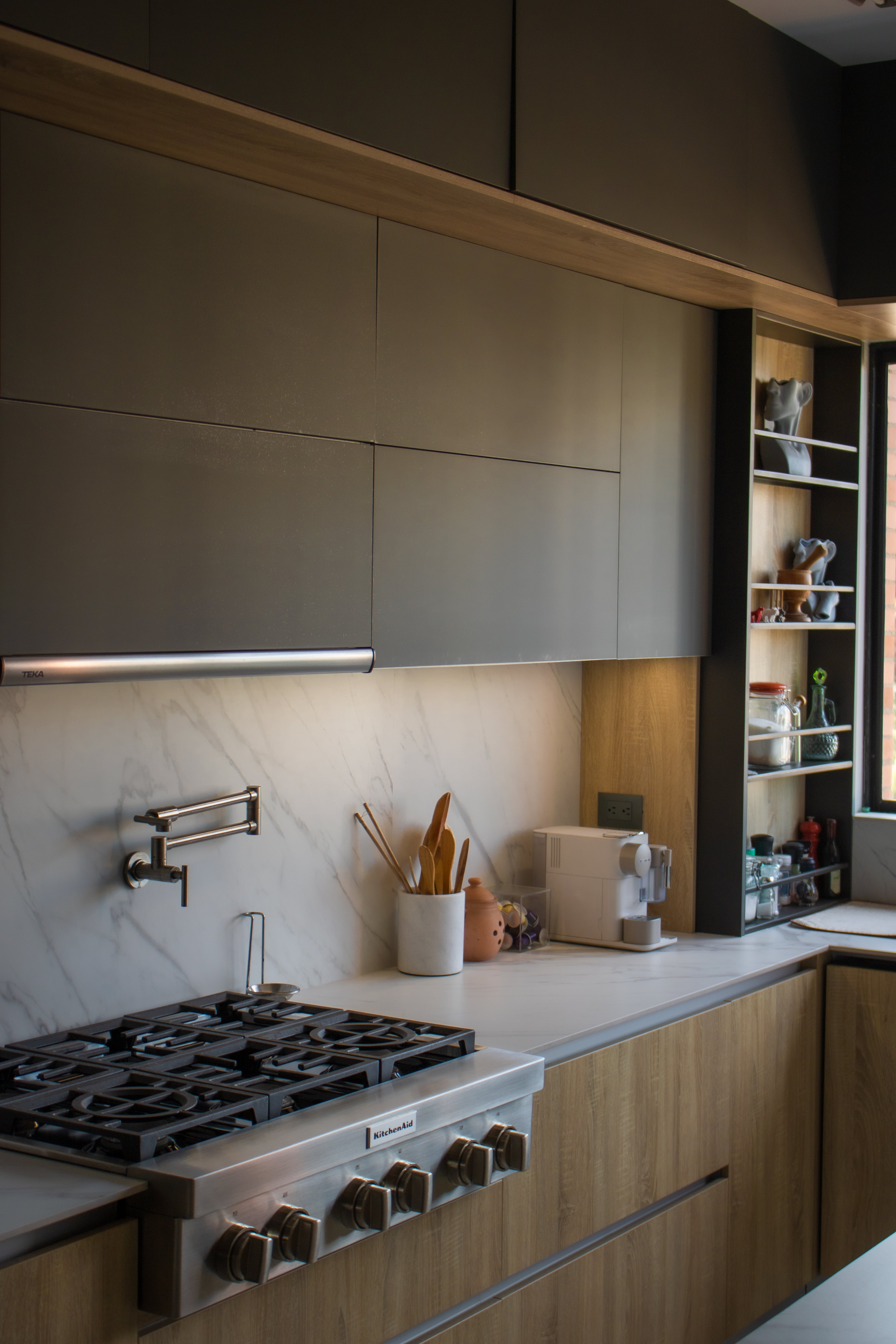 Este proyecto de cocina a medida hace parte de la remodelación total de un hogar ubicado en Pance, Cali, y se convirtió en el punto de partida para definir el estilo, la calidad y el lenguaje de diseño de todos los espacios del hogar. Desde el inicio, el objetivo fue claro: romper con los esquemas tradicionales y transformar la cocina en el verdadero protagonista de la casa.Nuestros clientes, apasionados por el café, el arte y el diseño, buscaban un espacio contemporáneo, funcional y con una identidad fuerte, que reflejara su estilo de vida y elevara la experiencia diaria dentro del hogar.
