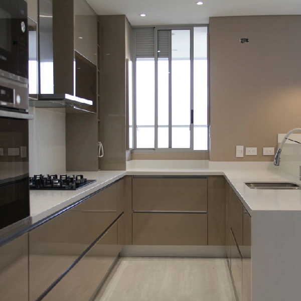 Mobiliario en Melamina Alto Brillo Cashmere y mesón en Neolith® Just White, reinterpretando el estilo de las tradicionales cocinas blancas con una variación de tonos claros.
